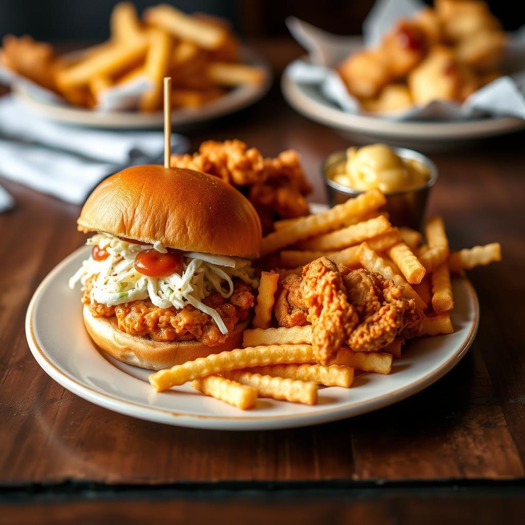 • Menu Highlights: Signature spicy chicken tenders and sliders take center stage, paired perfectly with buttery brioche buns and creamy kale slaw. Don’t forget the crispy fries and indulgent mac and cheese for sides that steal the show.